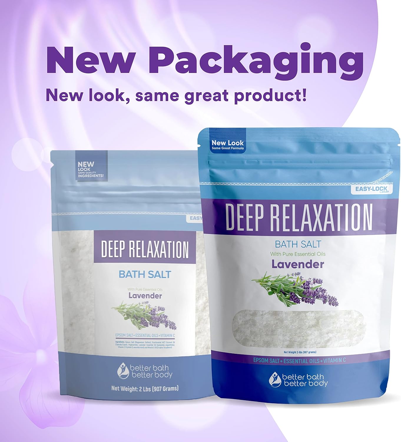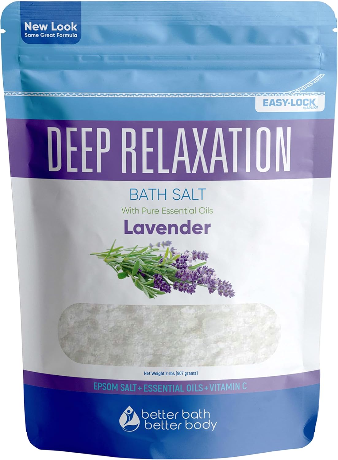 Deep Relaxation Bath Salt 32 Ounces Epsom Salt with Natural Lavender Essential Oil Plus Vitamin C in BPA Free Pouch with Easy Press-Lock Seal